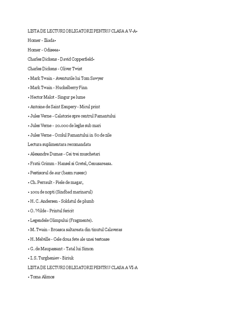 Lista De Lecturi Obligatorii Pentru Clasa A Va