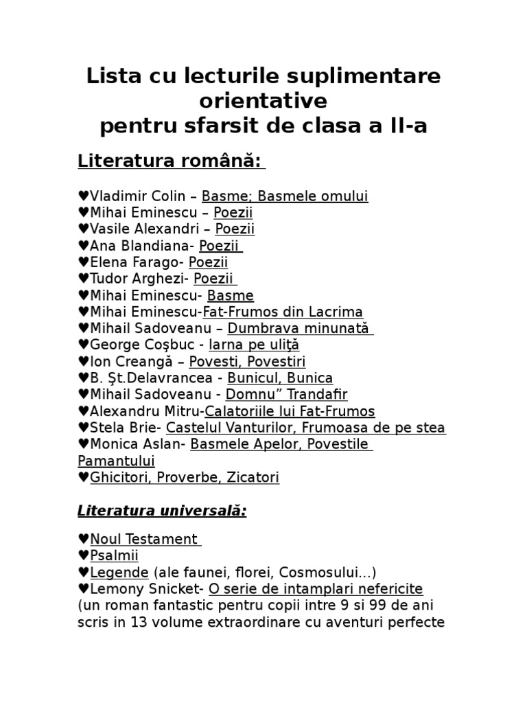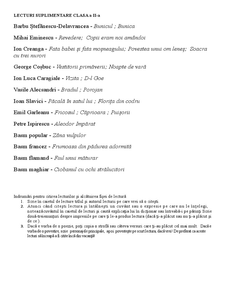 Lista Lecturi Suplimentare Clasa A Ii A Doc