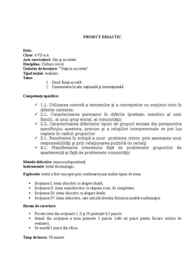 Teste De Evaluare Cultura Civica Doc
